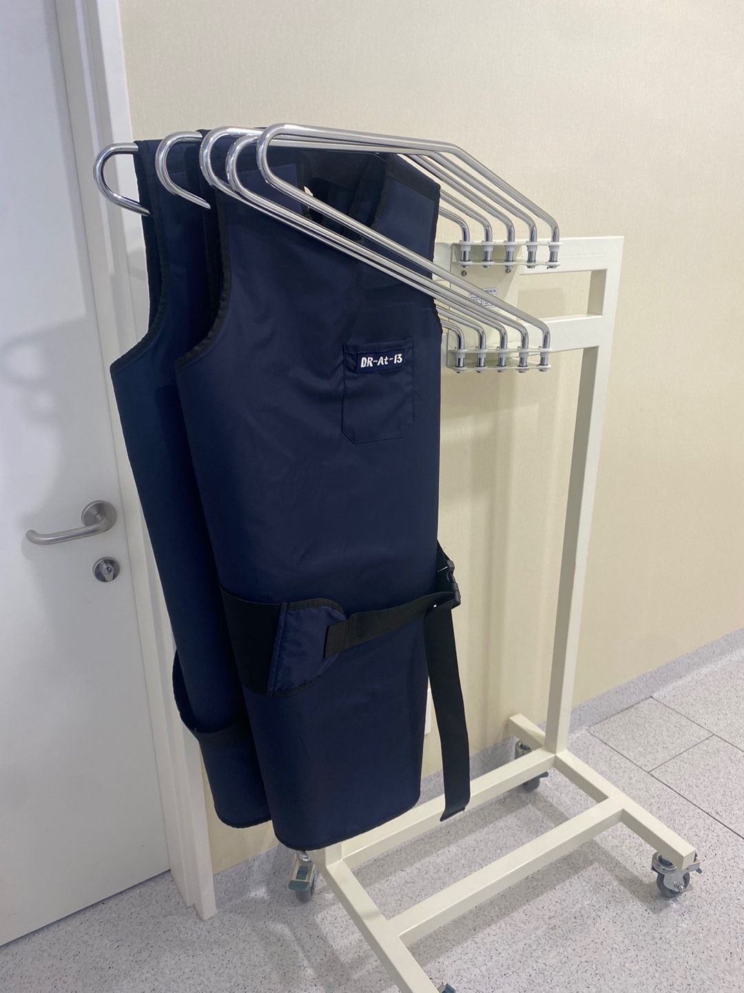 방사선 방어용구인 납 앞치마. 갑상선보호대를 손쉽게 보관할 수 있도록 제작된 제품입니다.
